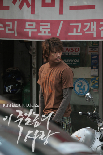 some pics from the show! i loveeeeee rain's look in this show. it's soo....manly!!! HAHA...and he lost 7 kg for this show too cos he is a K-1 fighter at first (like boxer lidat) and after that he became a bodyguard...he had to diet and skip 2000 times per day lah...oh my god...but oh man, i tell u, his bod shows all the results!!! defined abs and all man! but i think he put back all the weight after the show liao...it was very xin1 ku3 for him to film this show man...